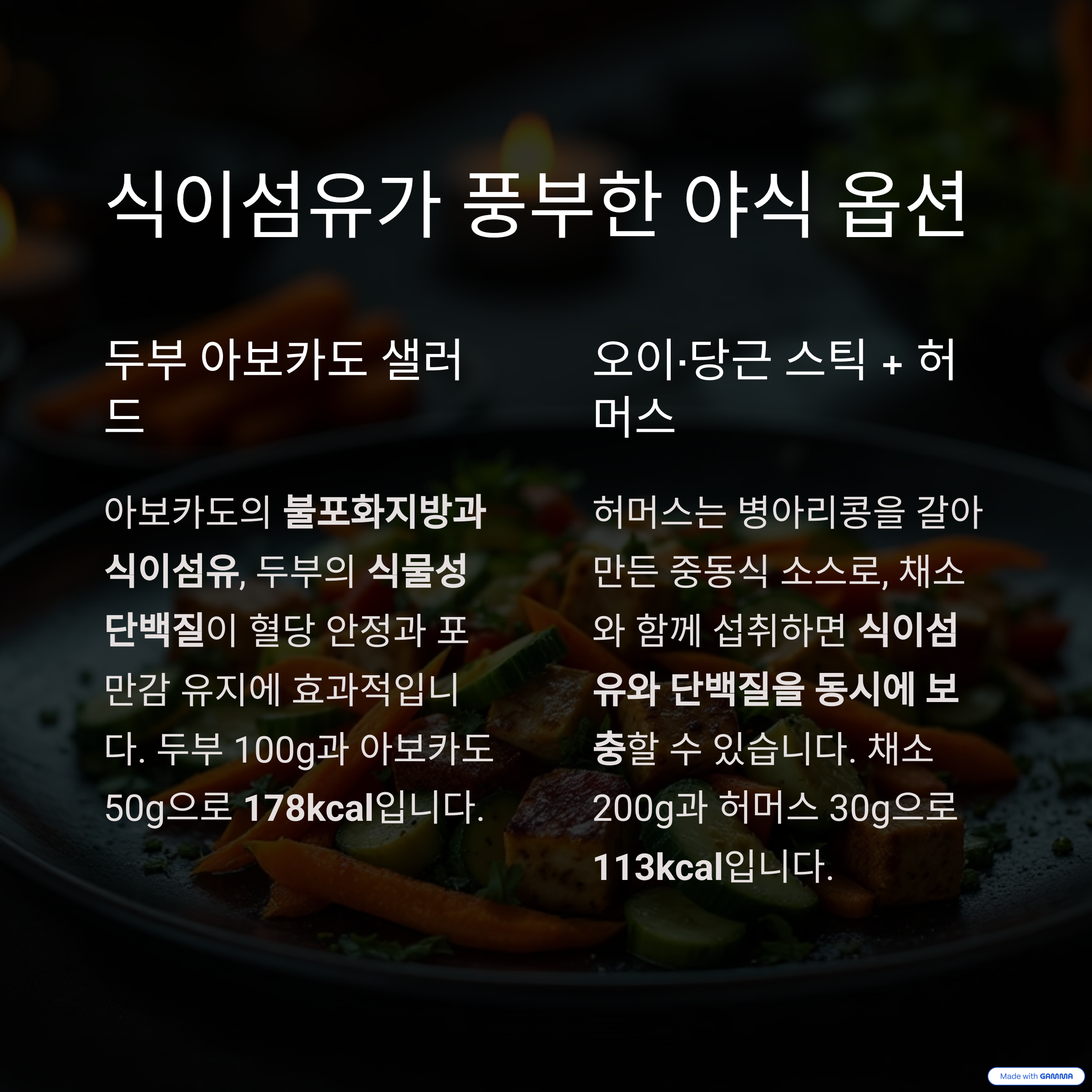 두 가지를 섞어 만든 샐러드는 혈당 안정과 야식 후 포만감 유지에 효과적입니다.