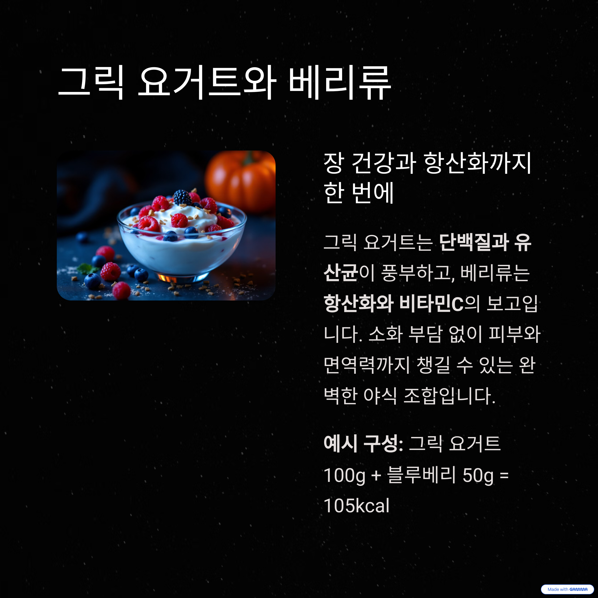 예시 구성: 그릭 요거트 100g + 블루베리 50g = 105kcal