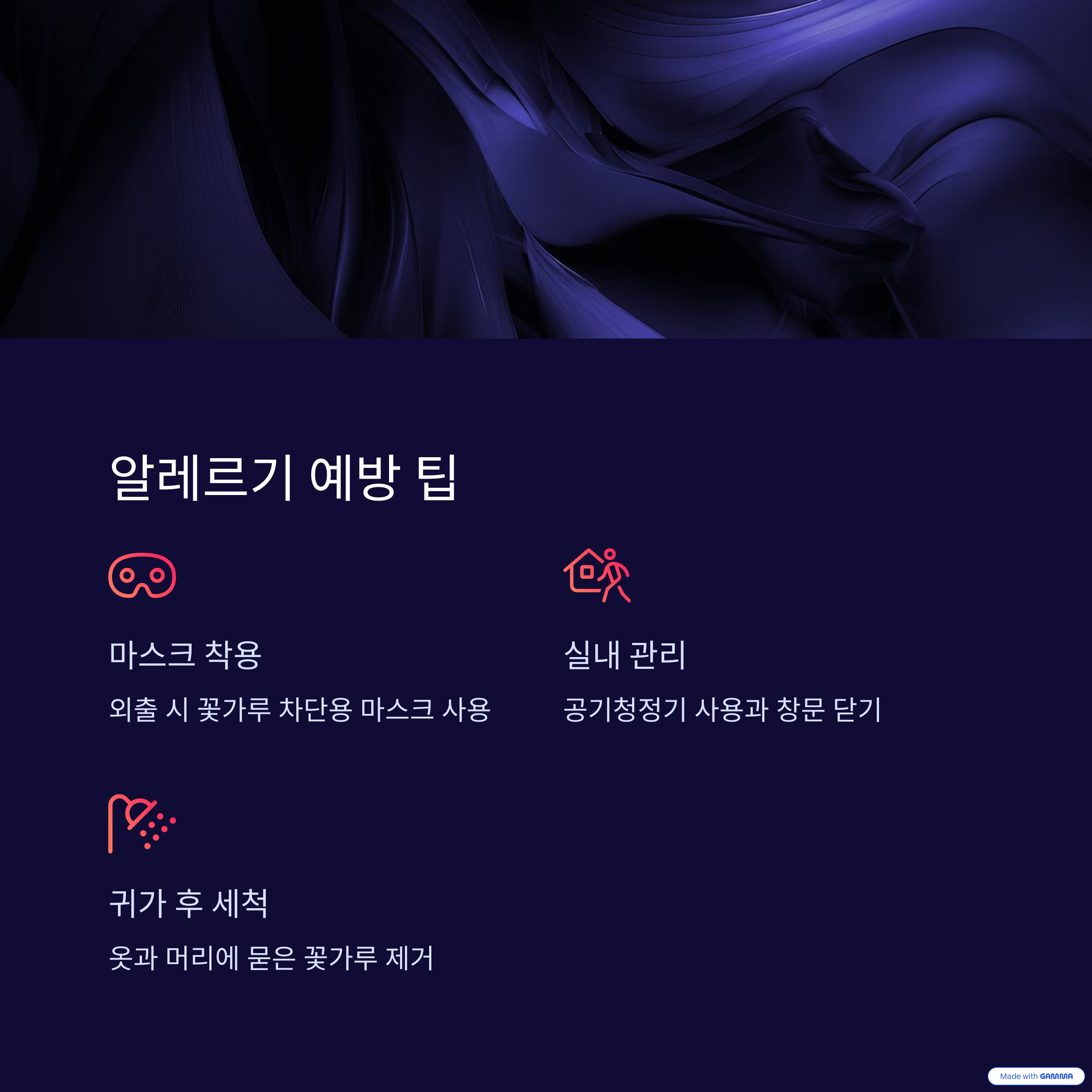 또한, 외출 시에는 마스크와 선글라스를 착용하여 꽃가루와의 접촉을 최소화해야 합니다.