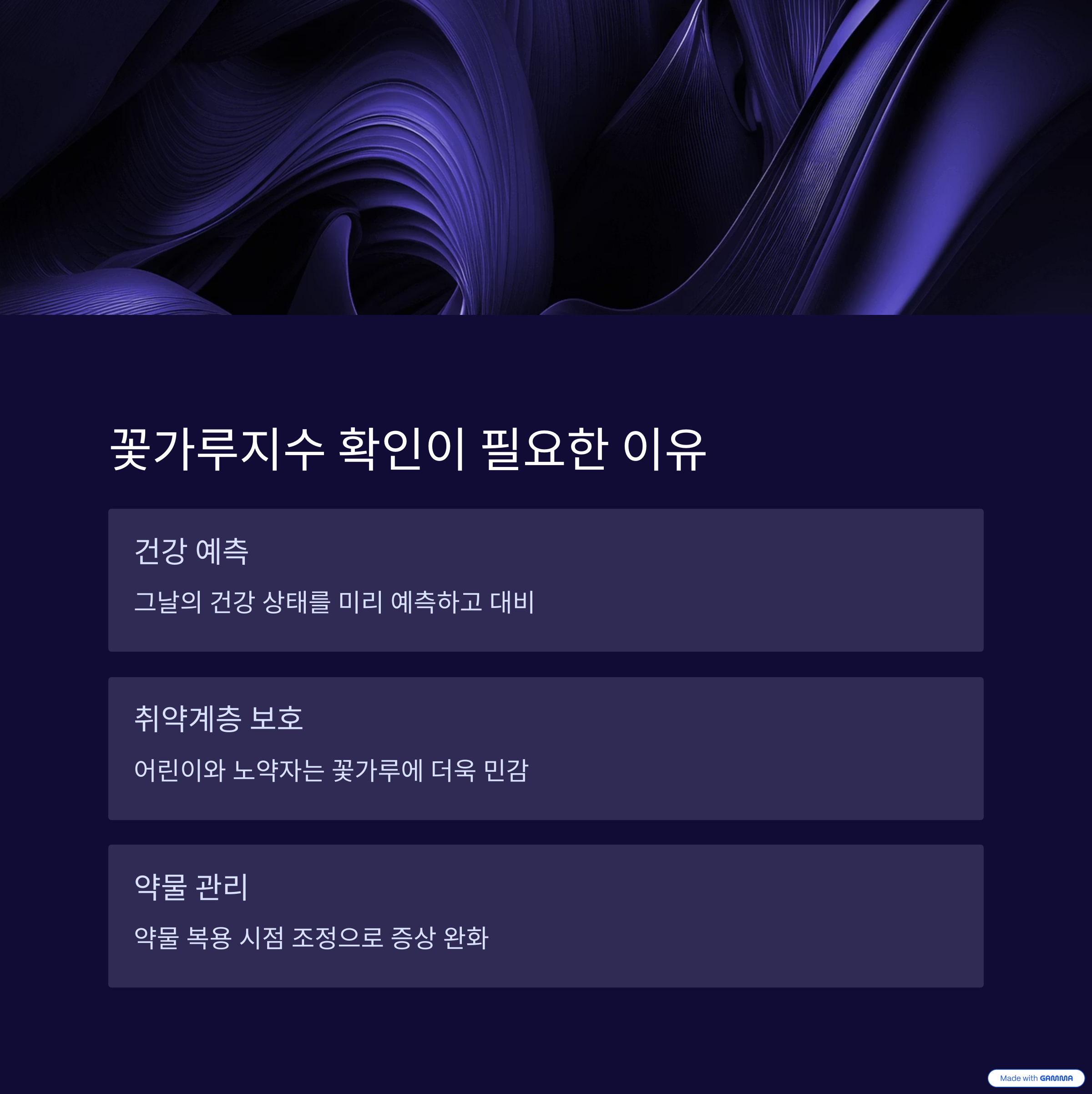 꽃가루지수를 확인하면 건강 관리를 보다 체계적으로 할 수 있습니다. 예를 들어, 꽃가루 농도가 높은 날에는 외출을 자제하고, 실내 공기질을 관리하는 것이 중요합니다.