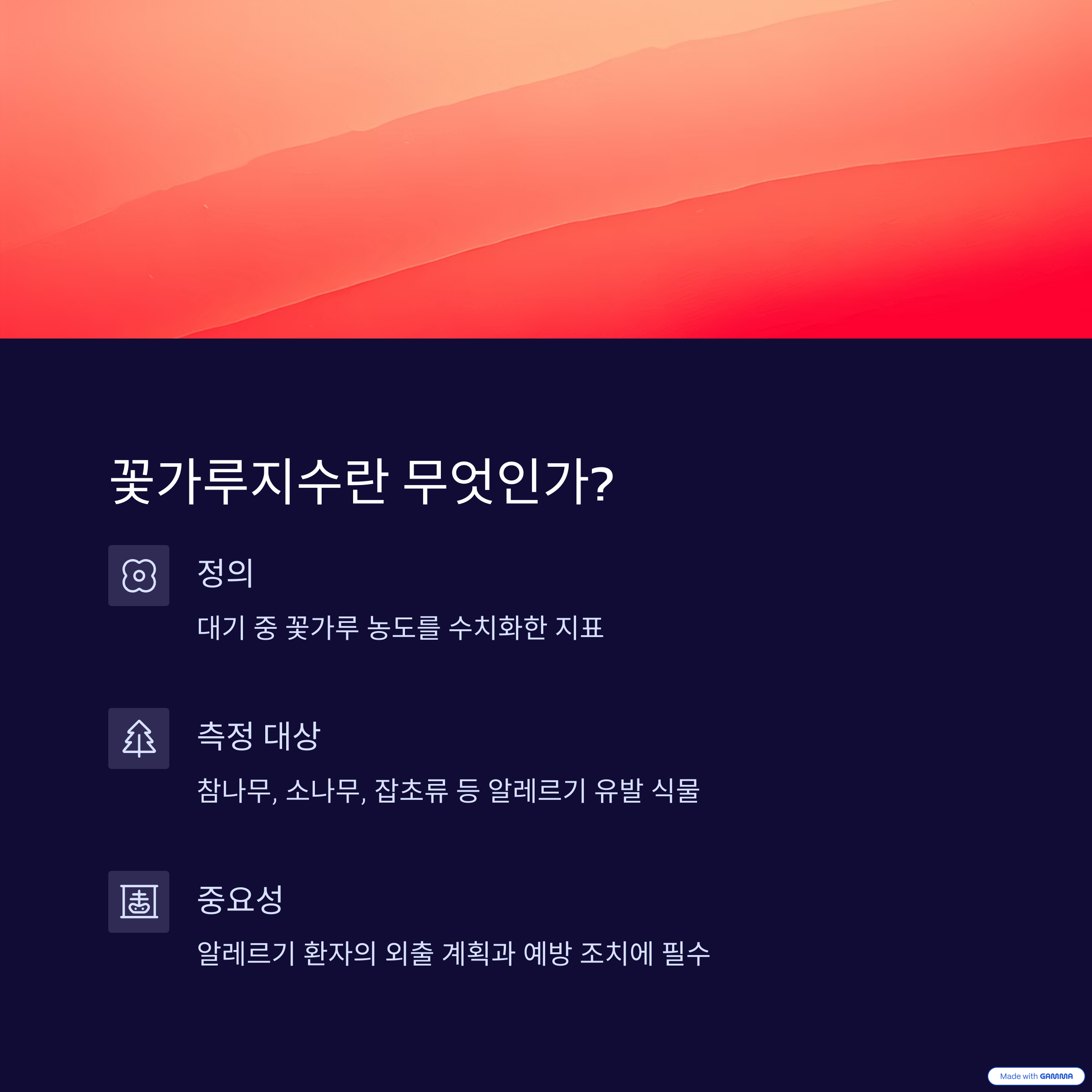 꽃가루지수는 대기 중에 떠다니는 꽃가루의 농도를 수치화한 지표입니다. 주로 참나무, 소나무, 잡초류 등 알레르기를 유발할 가능성이 높은 식물의 꽃가루 농도를 측정하여 발표합니다.