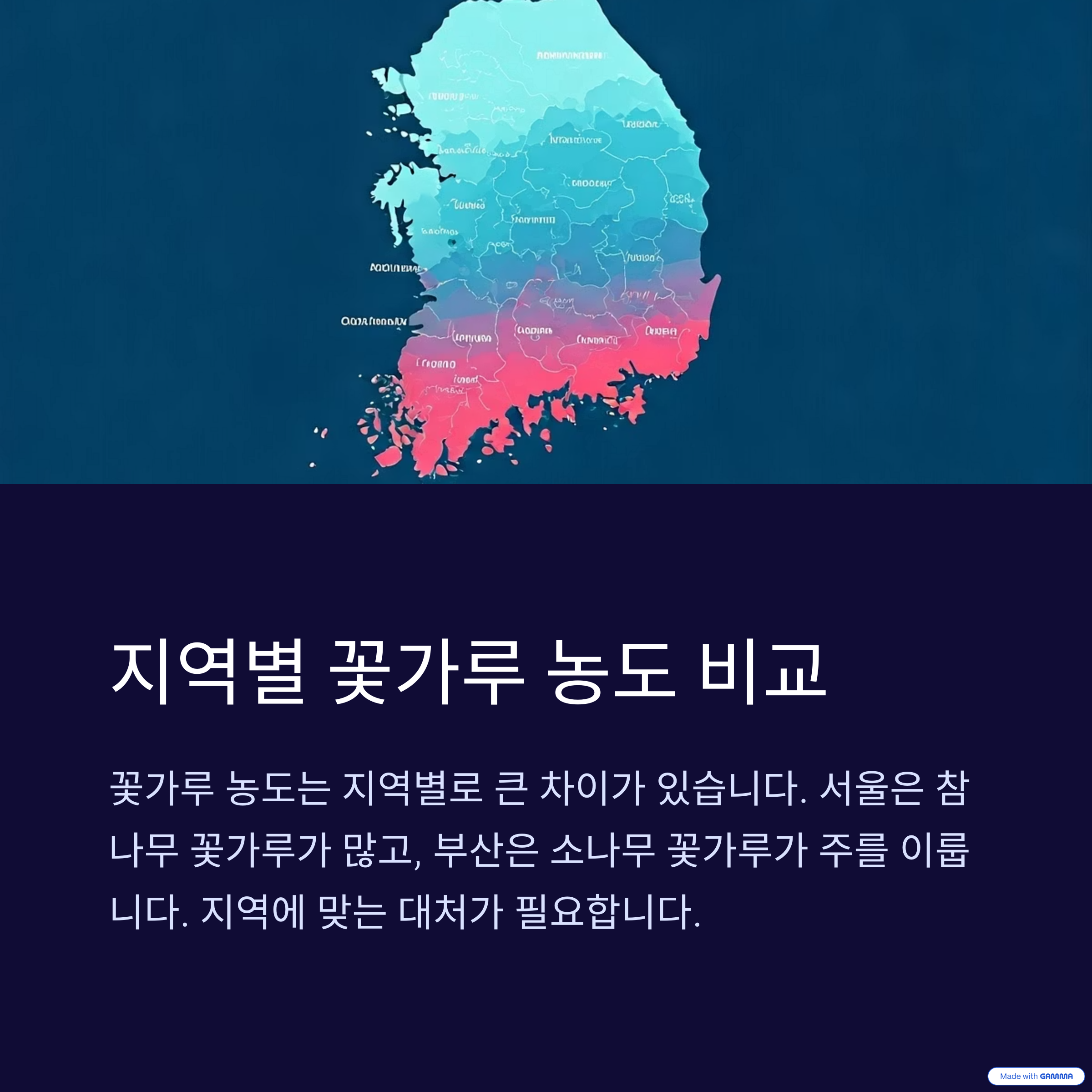 꽃가루 농도는 지역별로 큰 차이를 보일 수 있습니다. 예를 들어, 서울은 참나무 꽃가루가 많고, 부산은 소나무 꽃가루가 주를 이룹니다. 따라서 지역별 꽃가루 농도를 확인하고 대처하는 것이 중요합니다.