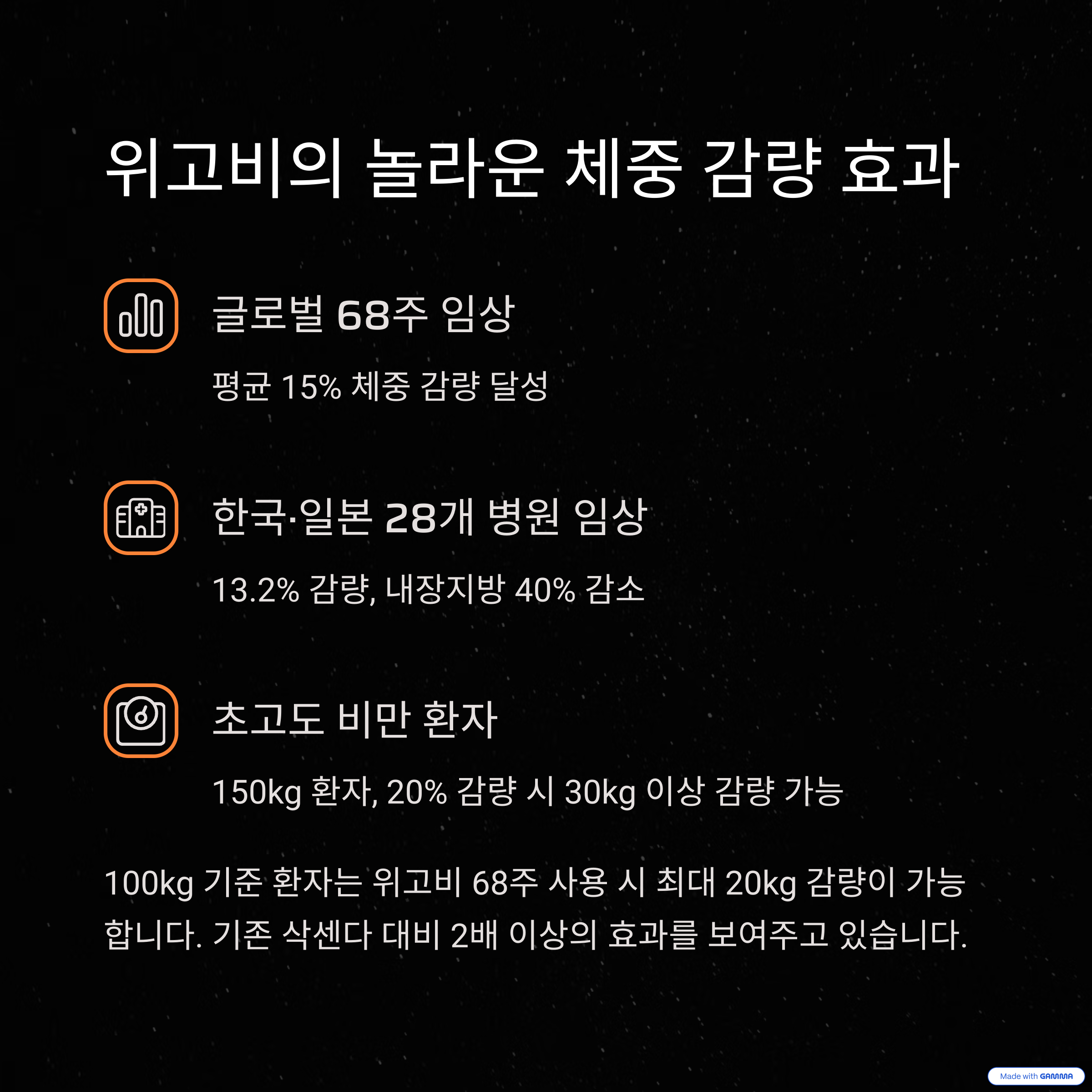 - 기존 삭센다 대비 2배 효과: 삭센다 7.5% vs 위고비 15%
