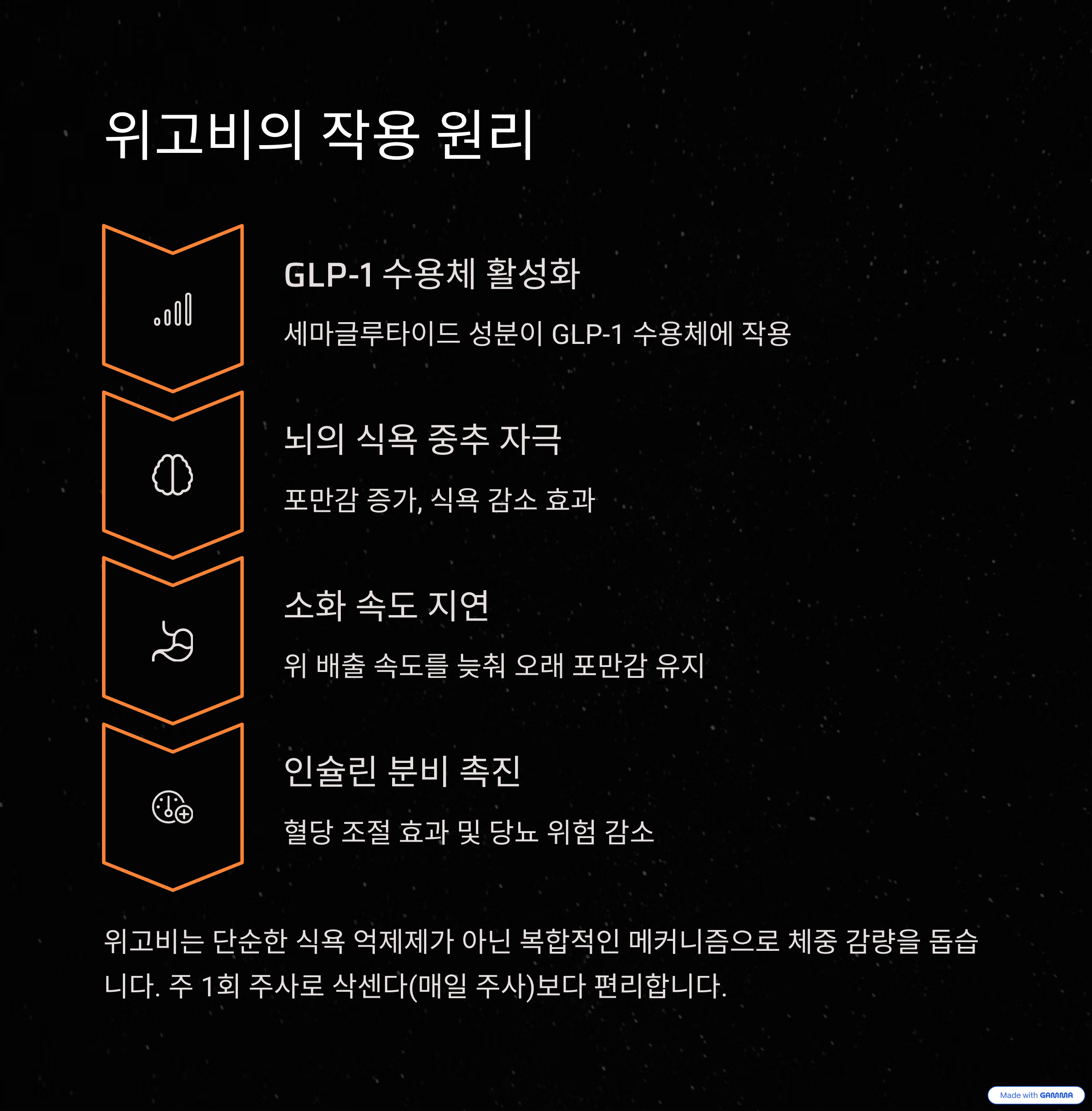 세마글루타이드(Semaglutide)를 주성분으로 한 위고비는 식욕을 억제하고 포만감을 유지하는 방식으로 작용합니다.
