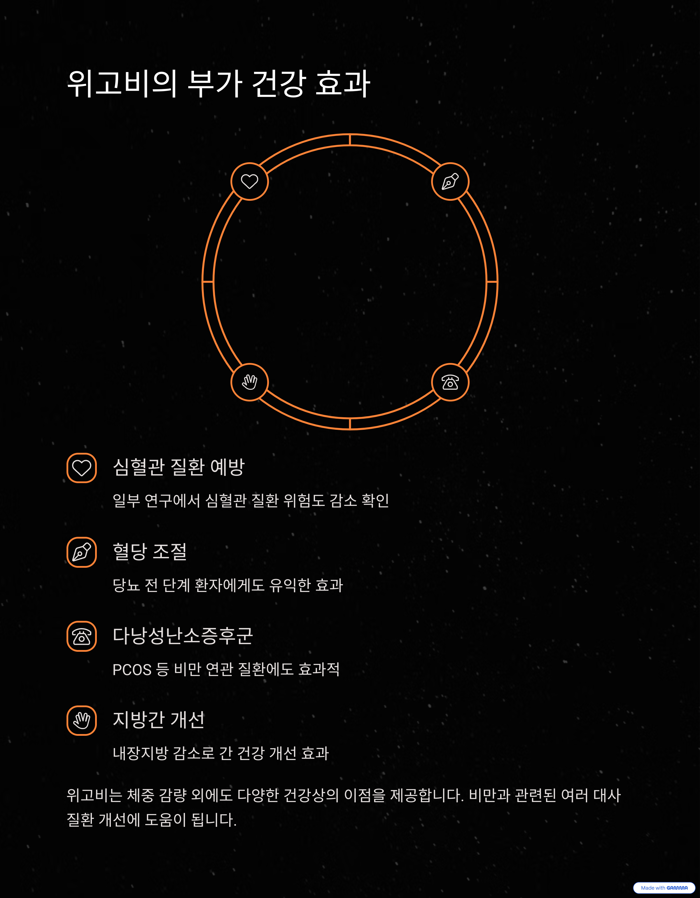 - 효과: 68주간 평균 15% 체중 감량, 내장지방 40% 감소