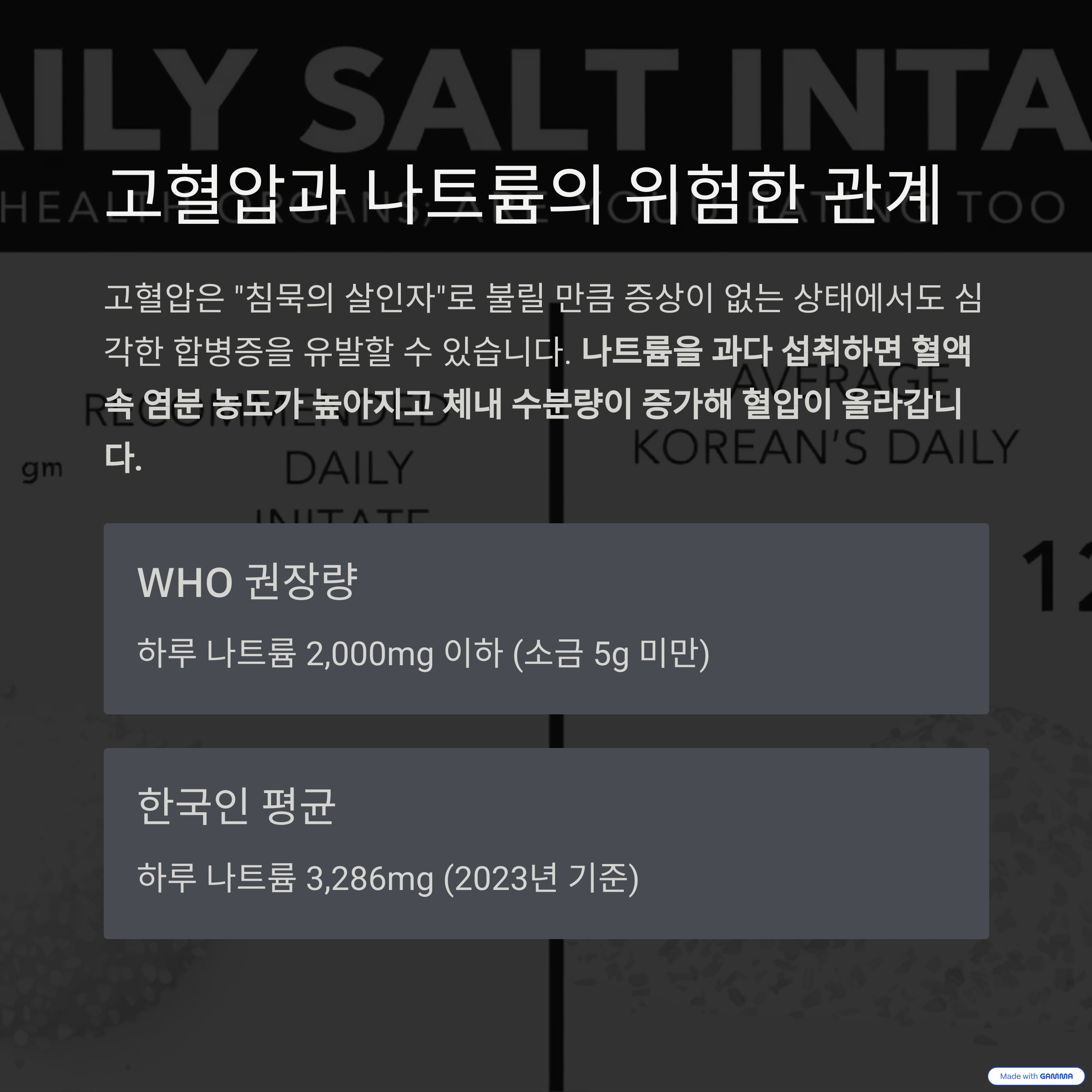 | 평균 섭취량(한국) | 3,286mg (소금 약 8.2g) | WHO 권장량의 1.6배 |