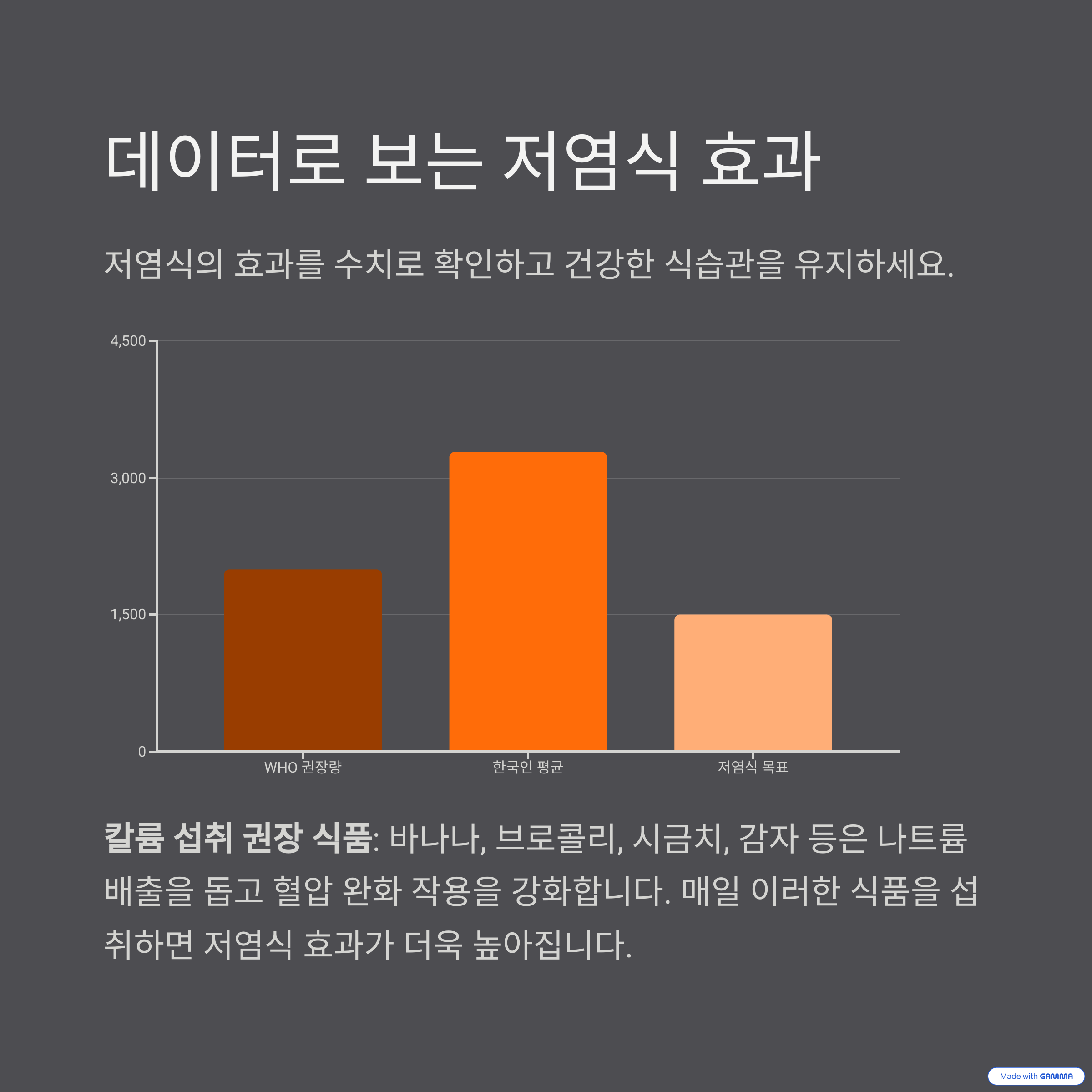 | 저염 실천 효과 | 1,500mg 섭취 시 수축기 4~6mmHg 감소 | 뇌졸중, 심혈관질환 위험 감소 |