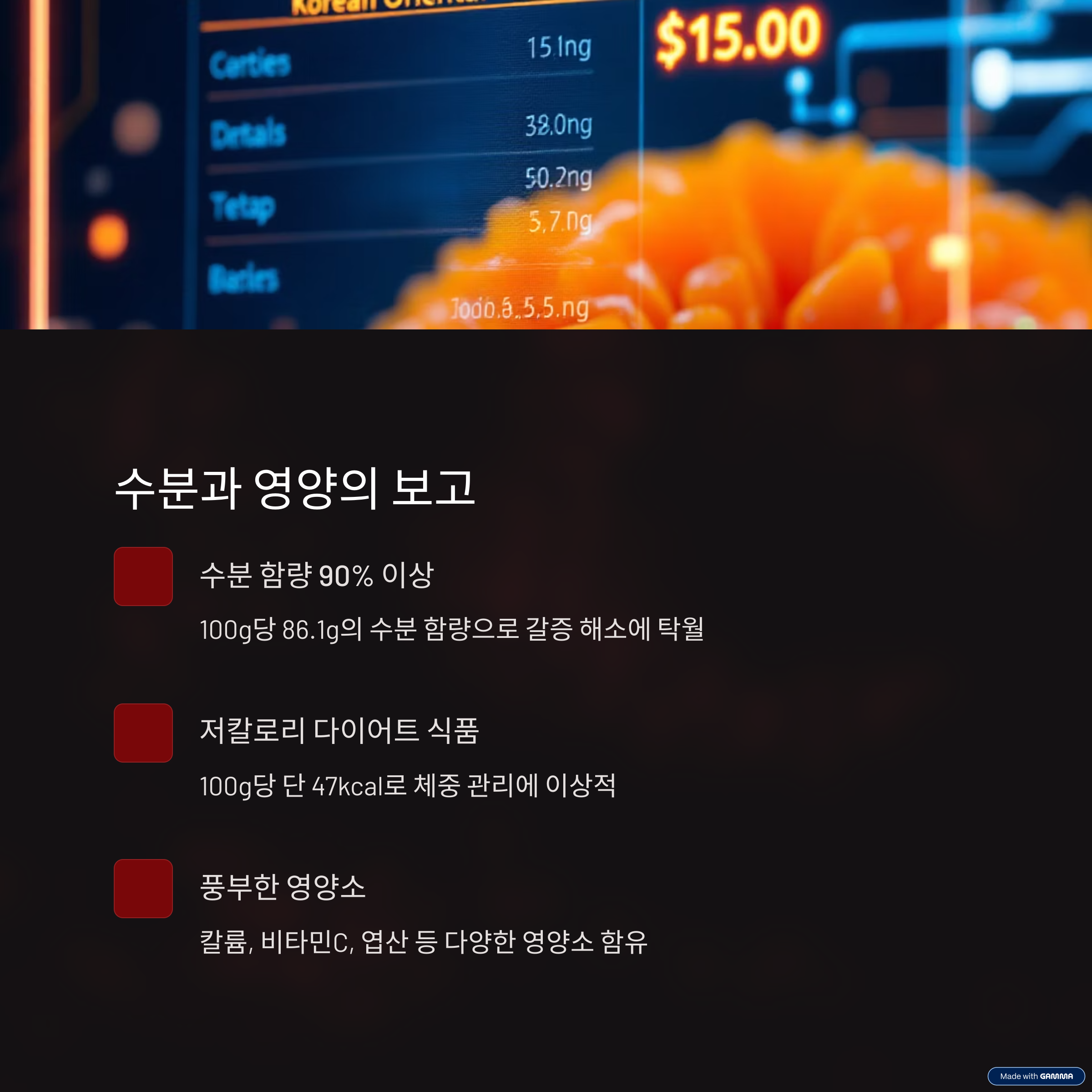 • 수분 함량이 90% 이상으로, 더운 계절에 수분 공급과 갈증 해소에 효과적입니다.