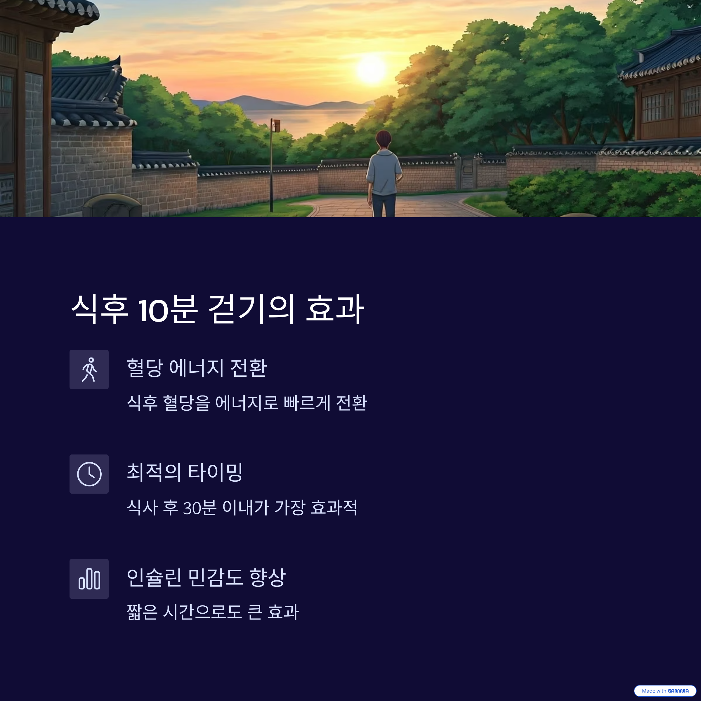 특히 식후 30분 이내의 걷기는 인슐린 민감도를 높여줍니다.