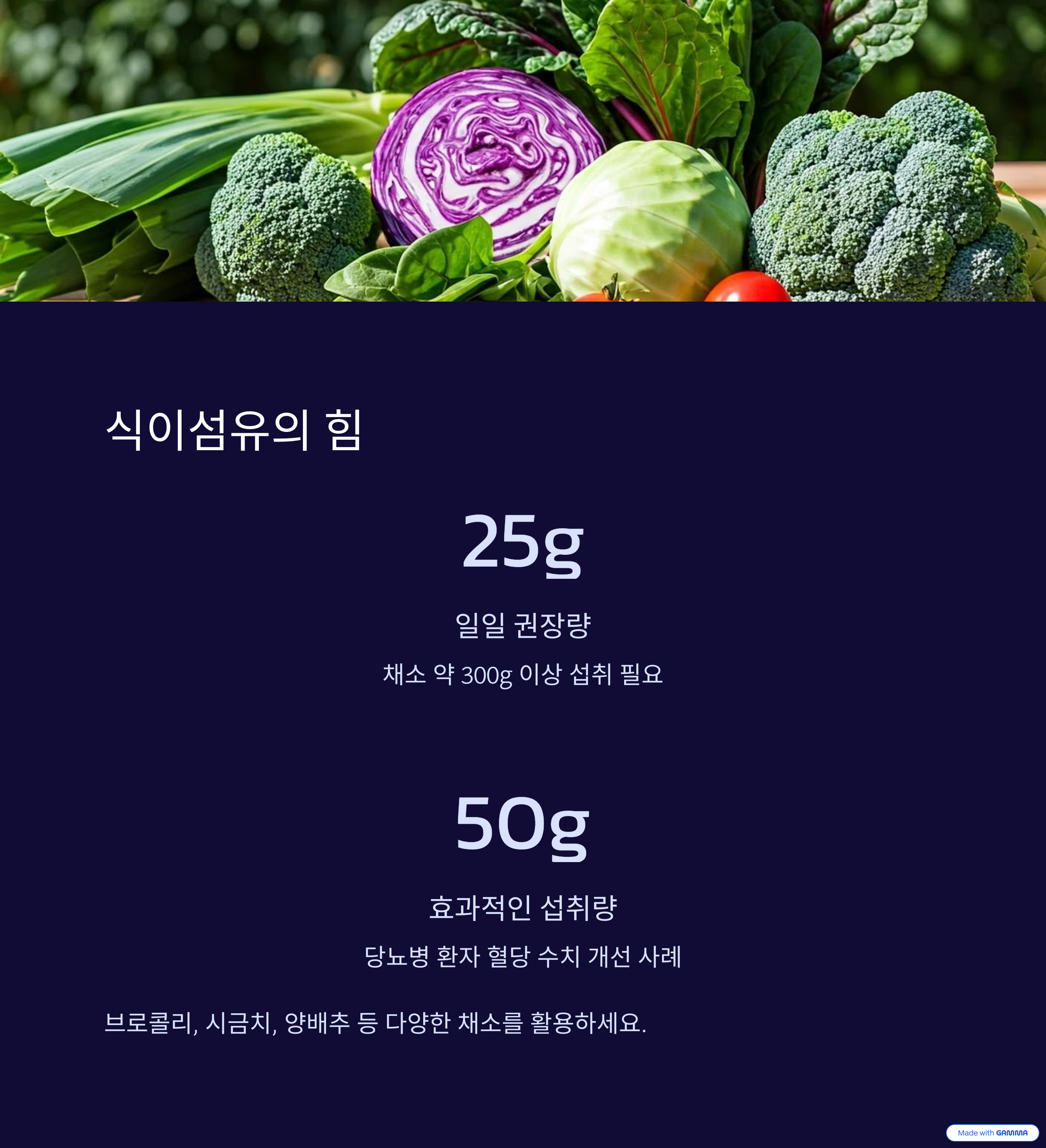 식이섬유 섭취량 20~25g/일, 채소 300g 이상 식후 혈당 감소, 포만감 증가