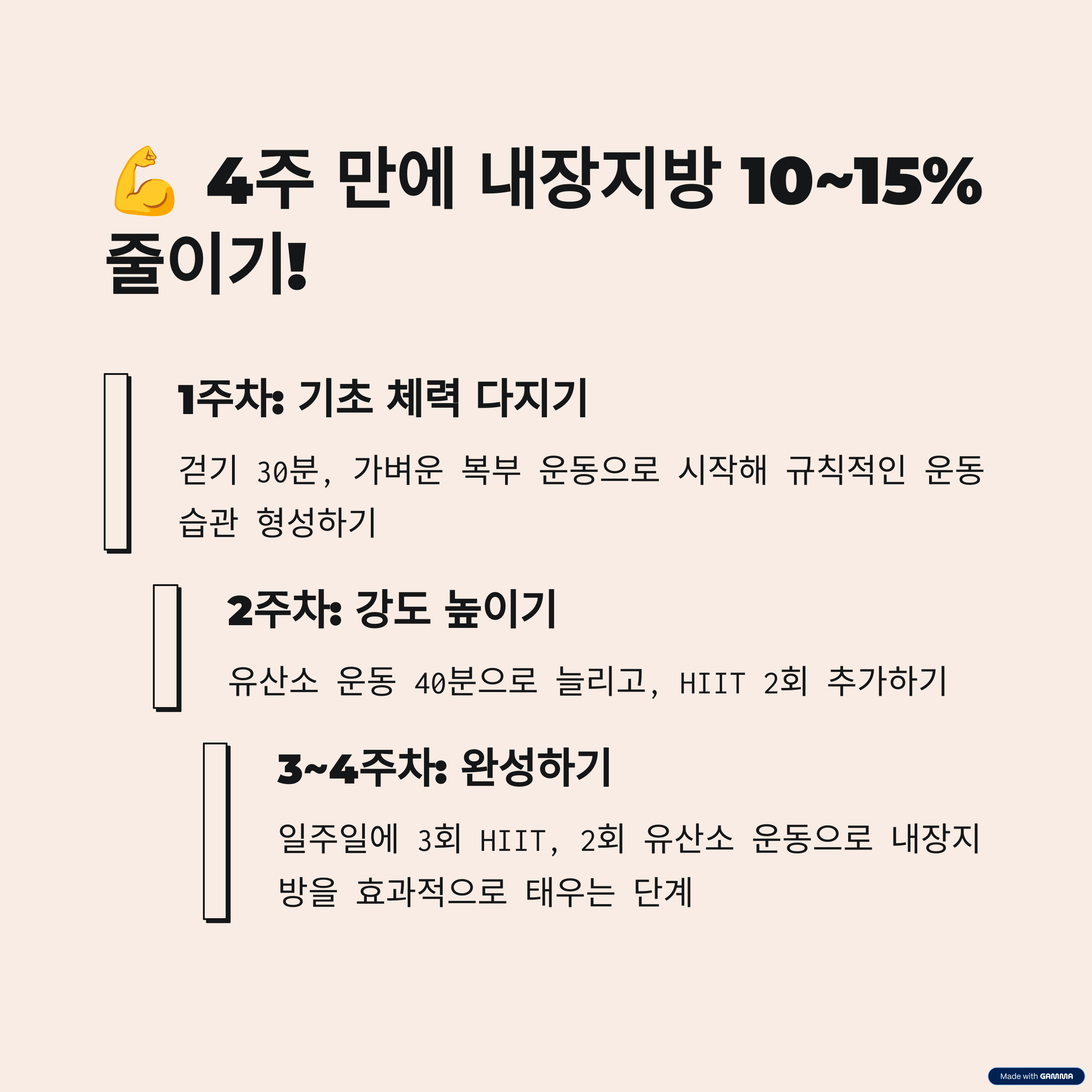 복부 지방, 특히 내장지방은 단순히 외형적인 문제를 넘어 건강을 심각하게 위협하는 요소입니다. 많은 사람들이 뱃살을 빼기 위해 다양한 운동을 시도하지만, 올바른 방법을 모르면 쉽게 지치고 효과도 미미할 수밖에 없습니다. 가장 중요한 것은 체계적인 계획과 꾸준한 실천입니다. 유산소 운동과 근력 운동을 병행하고, 무리하지 않으면서도 지속 가능한 루틴을 만드는 것이 성공의 지름길입니다.