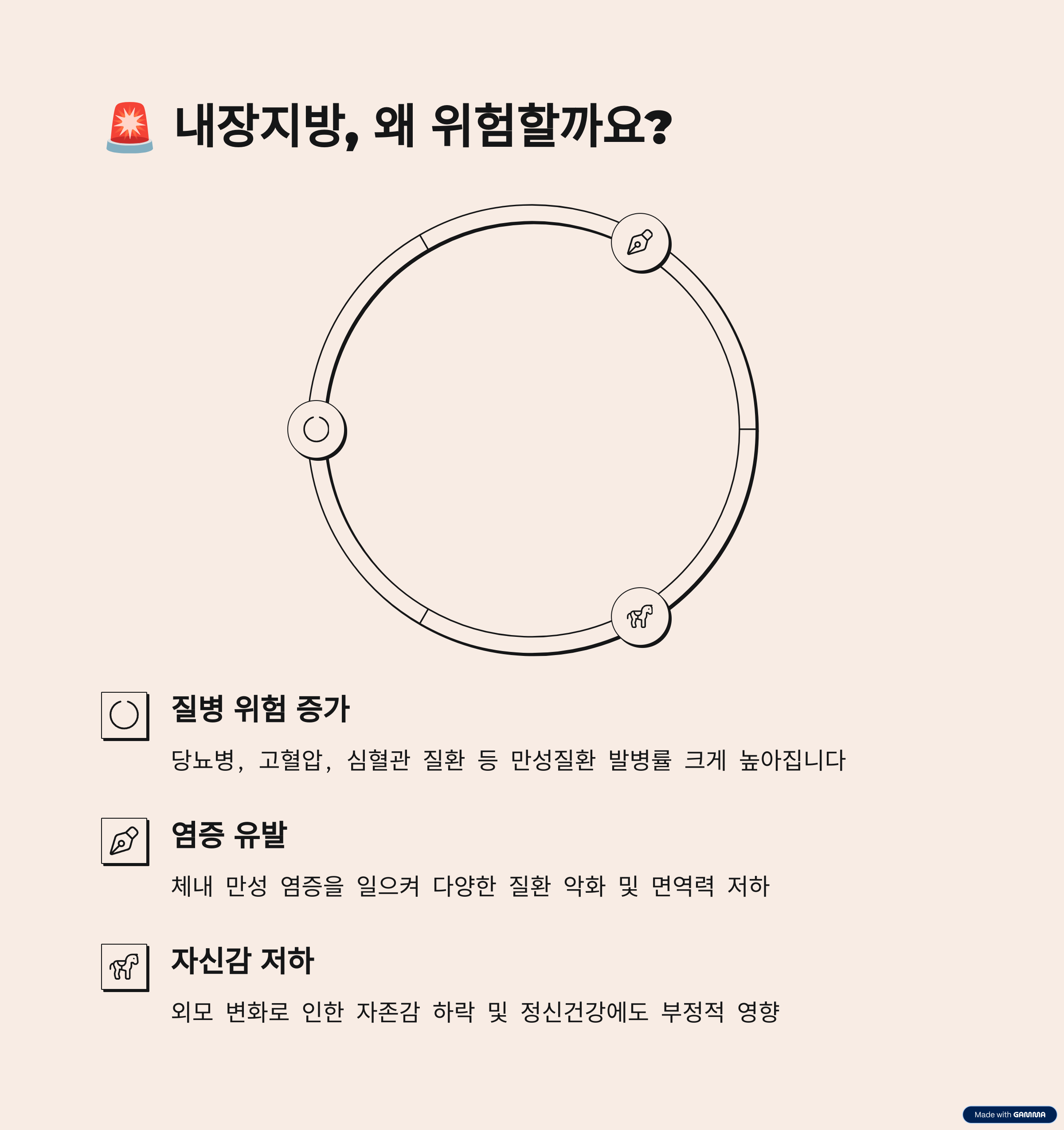 | 내장지방 위험성 | 대사증후군 등 질병 위험 2~3배 증가 |