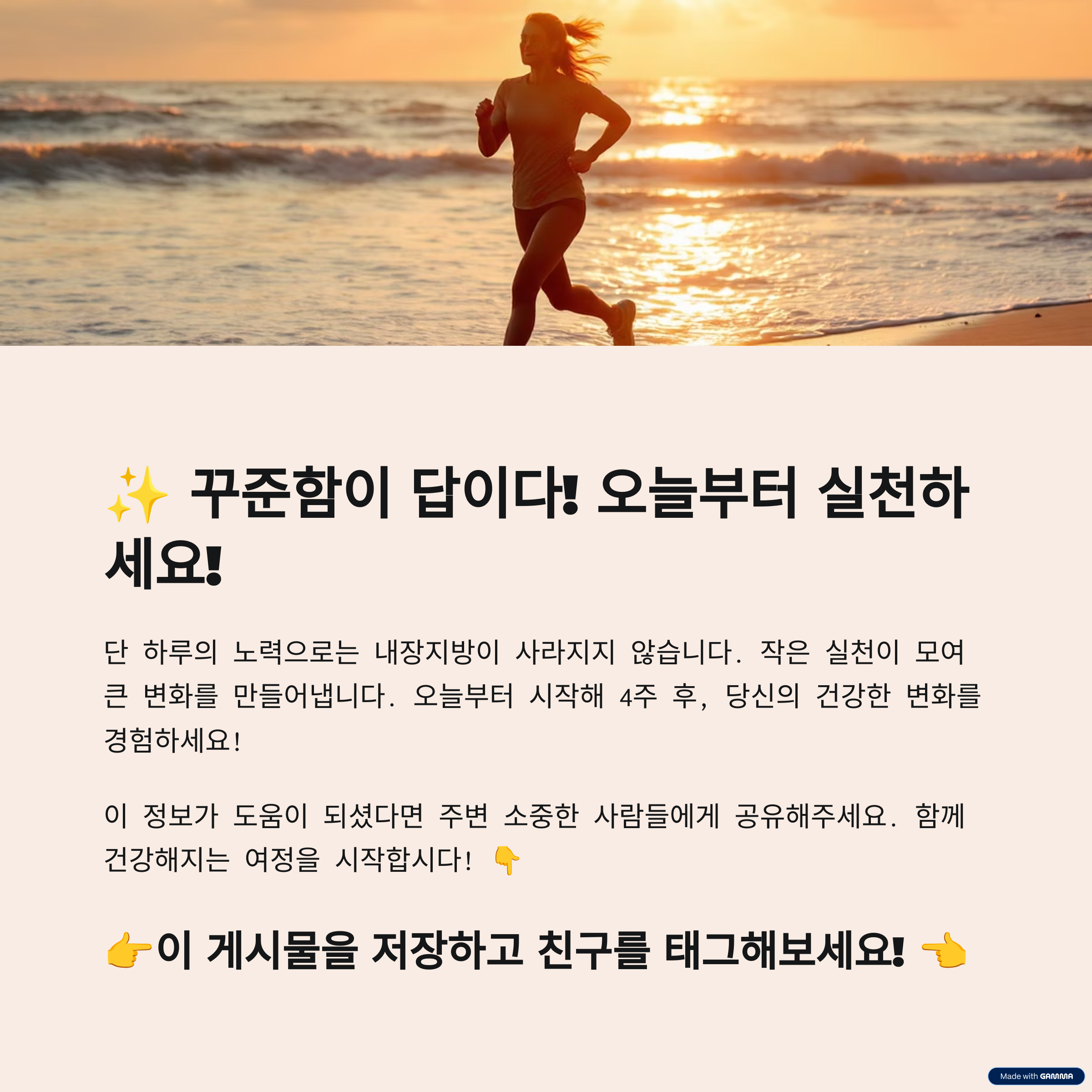| 꾸준한 실행으로 내장지방 감소 | 체지방 연소율 2배 상승 | 당분, 가공식품 제한 |