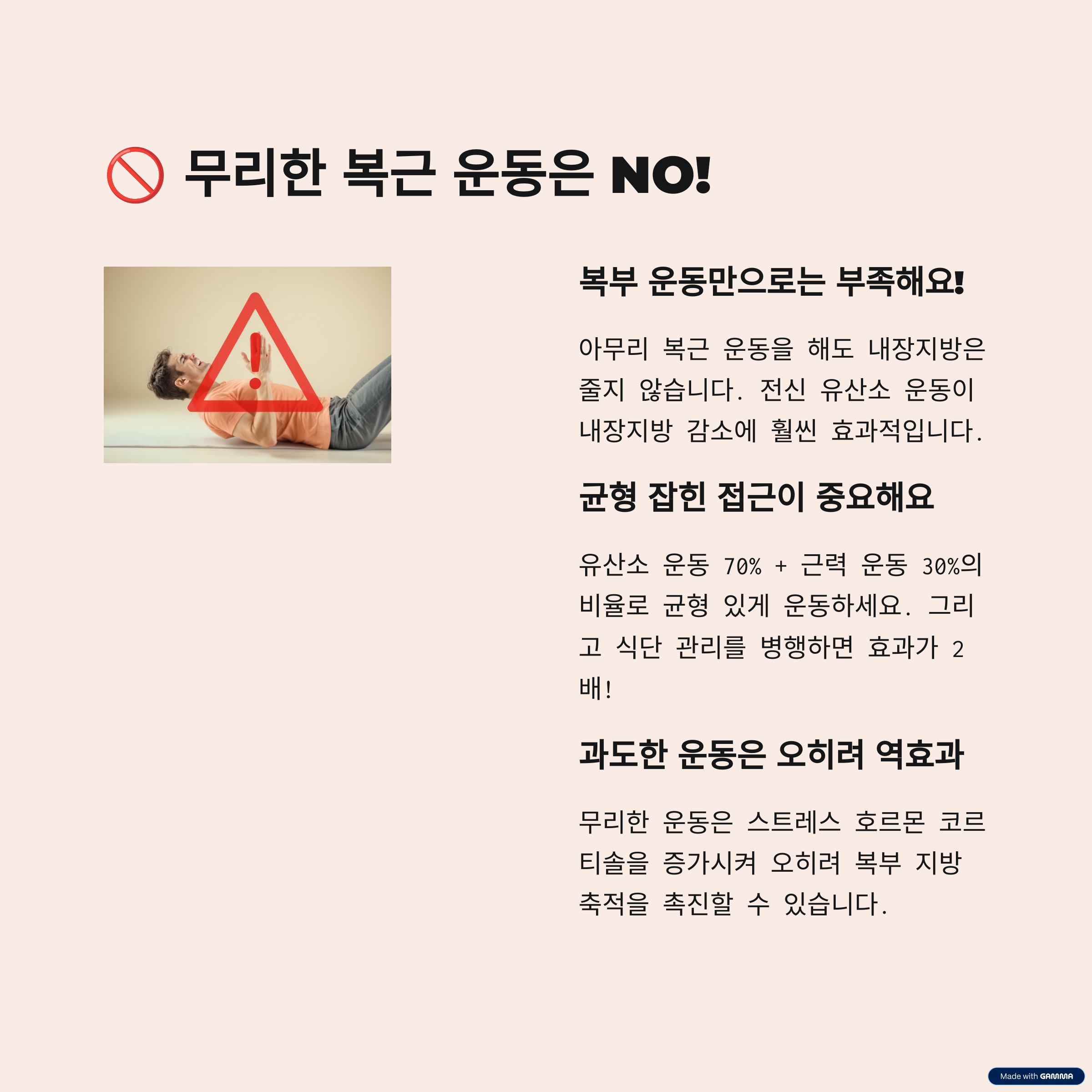 현대인이라면 누구나 한 번쯤 고민해봤을 복부 지방, 단순히 외모 문제를 넘어서 건강을 위협하는 요소입니다. 특히 내장지방은 각종 질병의 원인이 되기 때문에 체계적인 관리가 필수입니다. 하지만 잘못된 방법으로 운동을 하면 시간과 노력이 허사로 돌아가기 쉽습니다. 그래서 오늘은 수많은 연구와 데이터를 바탕으로 진짜 효과 있는 복부 지방 제거 운동법을 소개해 드리겠습니다. 무작정 따라 하는 운동이 아닌, 내 몸에 맞는 전략적인 접근이 필요합니다. 지금부터 알려드리는 방법을 통해 보다 효율적이고 안전하게 뱃살을 관리해보세요. 작은 실천이 모이면 분명 큰 변화를 가져올 수 있습니다. 건강한 삶을 위한 첫걸음, 함께 시작해볼까요?