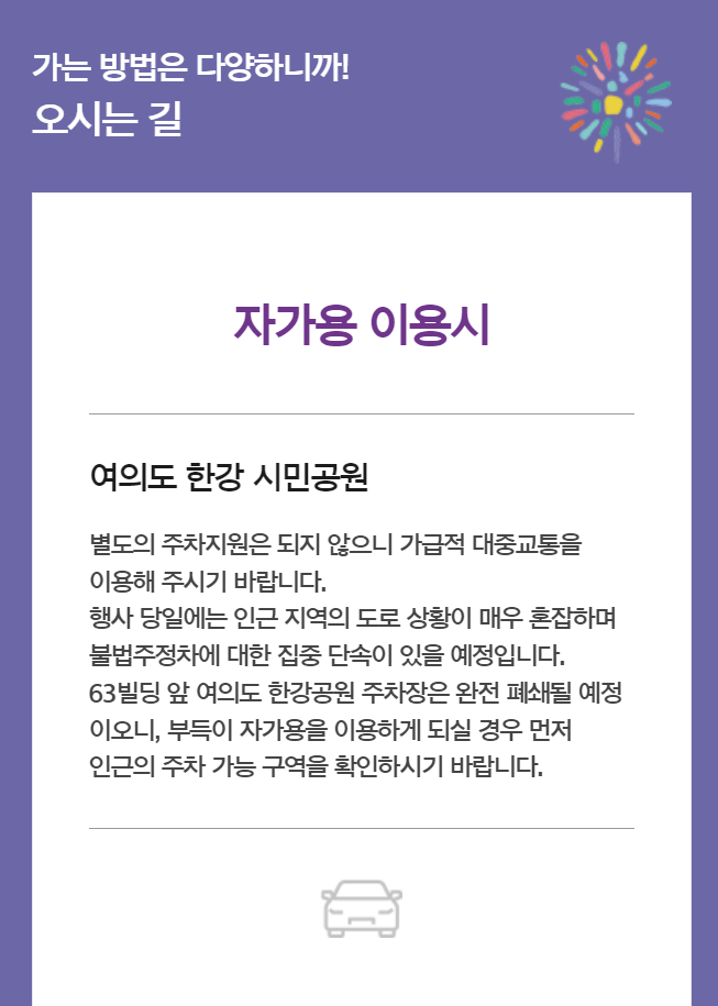 축제 당일에는 여의도 일대 교통 통제가 있을 수 있어요.