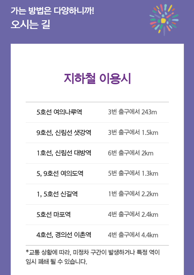 특히 '5호선 여의나루역'은 시민 안전을 위해 역사 내 혼잡상황에 따라 무정차 통과할 수 있다고 합니다. 서울불꽃축제 방문을 하실 계획이면 주변의 다른 지하철역을 이용하는 것이 좋을 것 같습니다.
